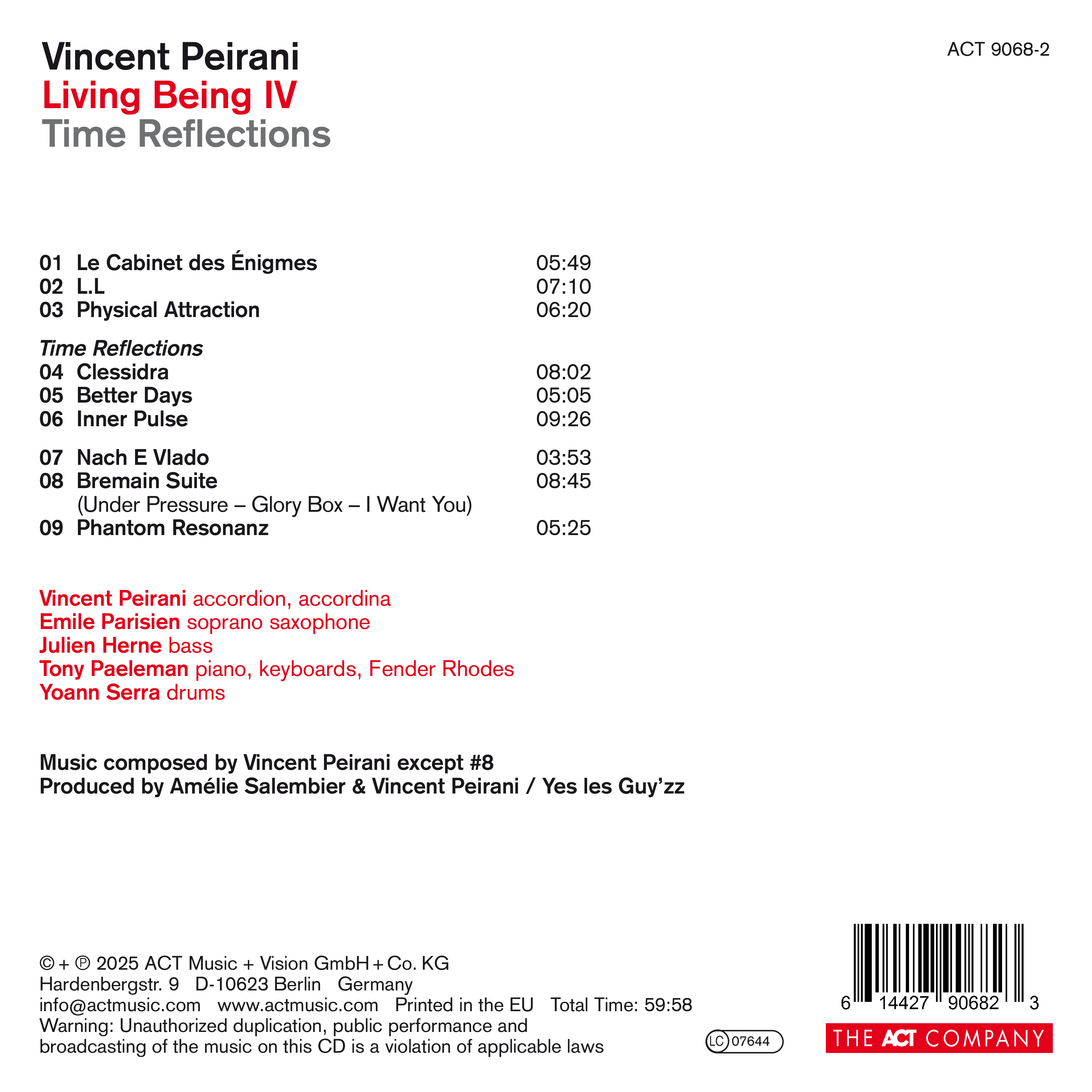 Ascoltando "Living Being IV: Time Reflections", siamo immediatamente colpiti dalla gamma di dinamiche, dall'intimità e dall'estroversione in gioco in ogni dettaglio, dalla ricchezza delle tessiture e dagli arrangiamenti che consentono momenti di sorpresa avvincenti. Vale la pena ricordare che, fin dall'inizio con Living Being, Vincent Peirani ha portato alla ribalta il concetto di musica da camera: un piccolo numero di esecutori, ognuno dei quali svolge una parte unica, ma con l'accento sul collettivo piuttosto che sull'individuale.