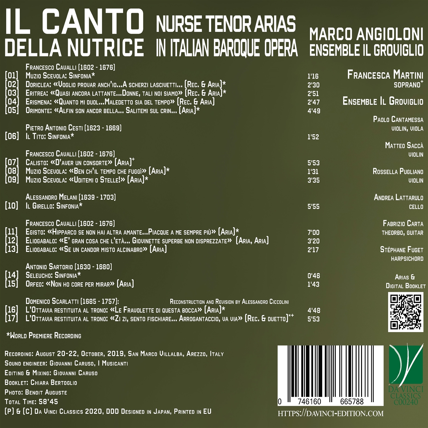 Disco d’esordio per il tenore barocco Marco Angioloni ed il suo Ensemble “Il Groviglio”. Esordio all’insegna del Seicento operistico in uno dei suoi aspetti forse meno noti, cioè la voce, in questo caso il canto, delle nutrici. Punto di forza a volte comico a volte drammatico all’interno del complesso mondo operistico del periodo, la nutrice ricopriva infatti ora la voce della ragione, sorta di coscienza interna dei personaggi, ora quello di personaggio comico volto a stemperare il dramma dell’azione. Angioloni ne ripercorre i passi, riscoprendo queste arie spesso in prima assoluta nelle opere di Cavalli, Cesti, Melani, Sartorio, sino a Domenico Scarlatti che ancora proponeva questo personaggio stilizzato all’interno di alcune sue opere. Il risultato non è solo la scoperta di un percorso nuovo, forse non dissimile allo sguardo di un Tom Stoppard, ma anche l’affacciarsi sulla scena barocca tanto di un cantante che di un ensemble di assoluta qualità esecutiva, in grado sin d’ora di aspirare ai livelli più alti dell’interpretazione barocca moderna. Angioloni segue e declama con forza introspettiva ognuno dei recitativi e dona quell’ingegno proprio delle nutrici, che hanno visto molta vita, alle arie che disvelano un’inusitata bellezza e costante meraviglia. Un disco in grado di soddisfare efficacemente i cultori del genere quanto coloro che vorrebbero approcciarsi in modo forse più lieve e divertito al grande repertorio dell’opera barocca.