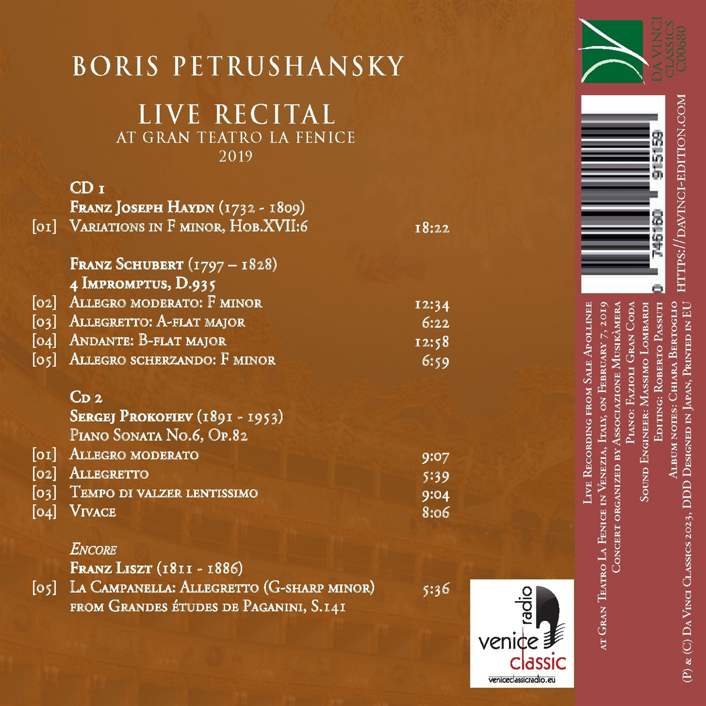 Il recital registrato dal vivo e pubblicato in questo album Da Vinci Classics offre una combinazione unica: un pianista leggendario, Boris Petrushansky, erede di una delle più importanti scuole di pianoforte nella storia del pianismo, quella di Heinrich Neuhaus e Lev Naumov; uno strumento superbo, realizzato a mano con eccezionale maestria; una location magnifica, negli edifici del bellissimo Teatro La Fenice di Venezia; e, ultimo ma non meno importante, un programma squisito, attraverso una grande varietà di stili sia in termini di storia della musica che di carattere generale dei brani. Petrushansky interpreta le preromantiche Variazioni in fa minore di Haydn, gli altrettanto toccanti ed emozionanti Impromptus op. 142 di Franz Schubert, e la possente Sesta Sonata per pianoforte di Prokofiev – il tutto sormontato da un emozionante bis, ovvero la parafrasi da concerto di Liszt su La campanella di Paganini. Questa registrazione dà così vita a un’esperienza indimenticabile, e ricrea le sensazioni di un evento unico che tramite essa si conserva per sempre..