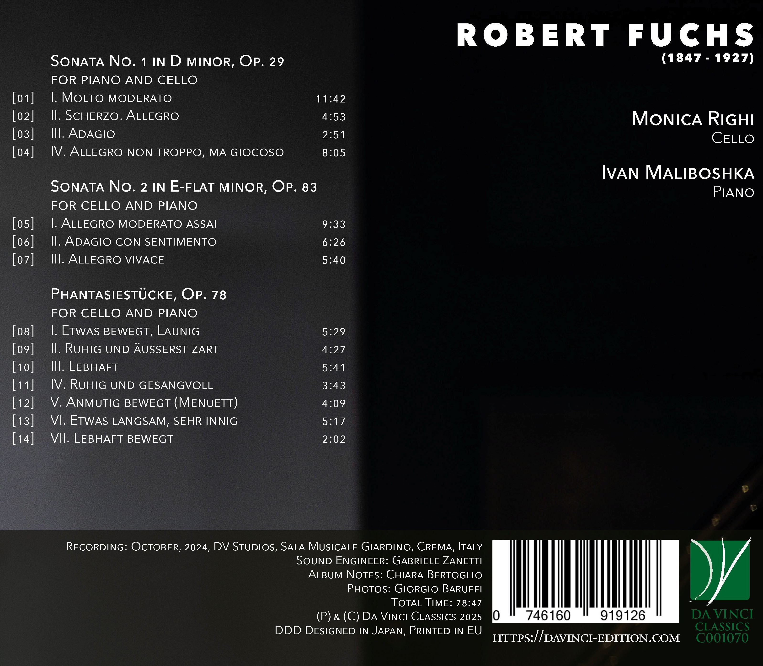 Questo album mette in luce le opere per violoncello di Robert Fuchs, compositore dalla voce raffinata e dall’influenza notevole, oggi fortunatamente di nuovo apprezzato. Stimato insegnante di Mahler, Wolf e Sibelius, Fuchs fu anche un compositore di grande valore egli stesso. La Prima Sonata per violoncello rivela un’energia giovanile e un lirismo che riecheggiano la tradizione tardo-romantica, con influssi di Brahms e Bruckner. I Phantasiestücke op. 78, ispirati a Schumann, costituiscono una serie di pezzi caratteristici eleganti, vivaci e ricchi di colore. La Seconda Sonata mostra una voce matura e sicura, in cui il lirismo viennese si unisce a chiarezza formale e calore espressivo. In queste pagine, il violoncello canta con intimità e brillantezza, accompagnato da un pianoforte in ruolo virtuosistico e ben calibrato. Nel loro insieme, queste opere rappresentano un’esplorazione rara e gratificante della musica da camera tardo-romantica; uniscono tradizione e originalità, profondamente radicate nell’eredità musicale viennese. Un invito a riscoprire una voce dimenticata, la cui musica risuona ancora con limpidezza e intensità emotiva.