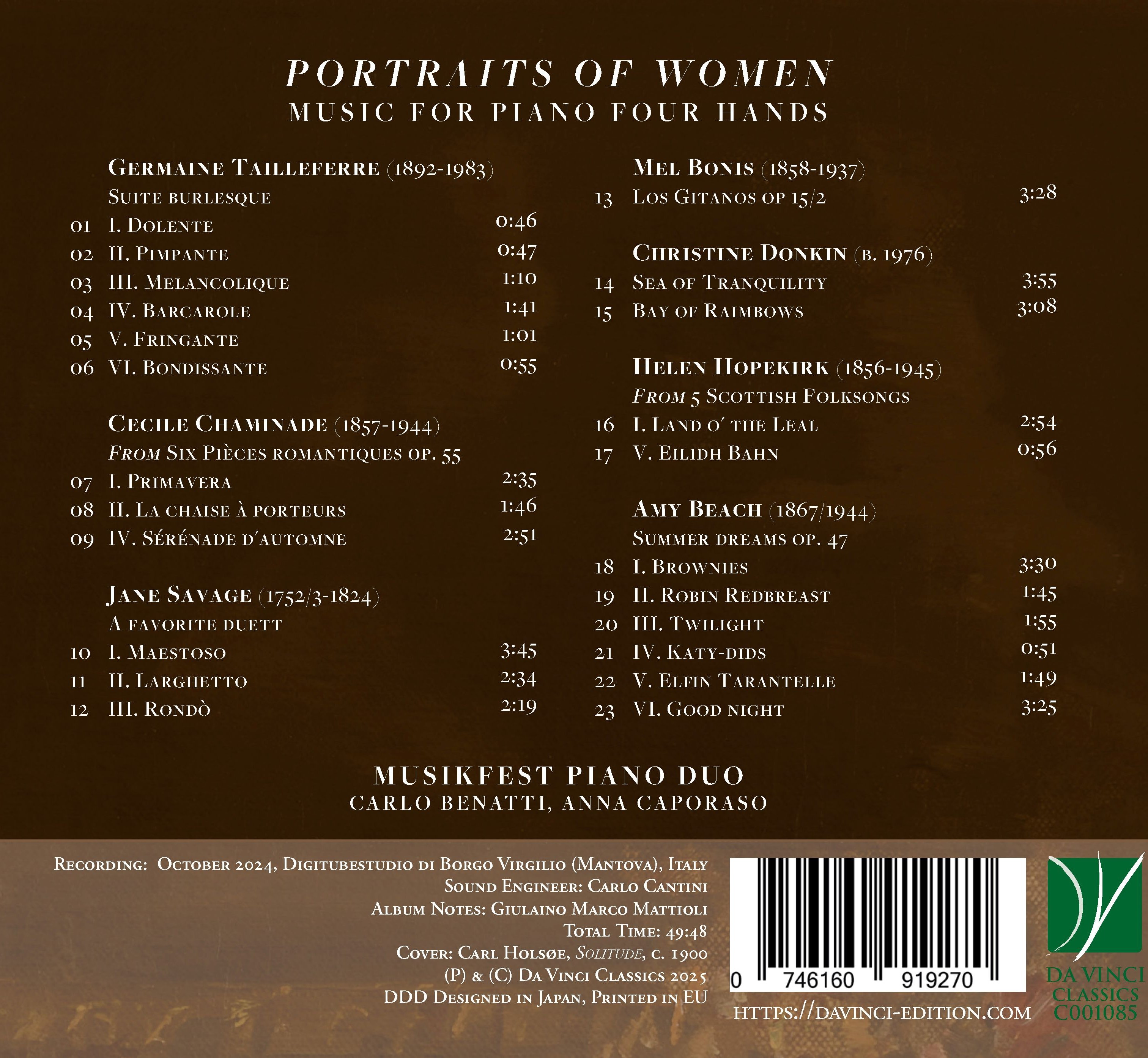 "Portraits of Women" accende una luce su compositrici che arricchirono il repertorio pianistico a quattro mani sebbene siano spesso rimaste ai margini. Il Musikfest Piano Duo – Carlo Benatti and Anna Caporaso – traccia un percorso dall’equilibrio classico di Jane Savage al romanticismo di Cécile Chaminade, dall’eleganza arguta di Germaine Tailleferre ai pezzi vividi di Mel Bonis; incontra l’ampiezza lirica di Amy Beach, le inflessioni folk di Helen Hopekirk e la limpidezza moderna di Christine Donkin. La scaletta rivela affinità: danze che strizzano l’occhio a salotti e piazze; notturni di coraggio quieto; miniature che dicono l’essenziale. Registrato con presenza intima, l’album restituisce una linea viva più che un bouquet di curiosità: voci per sale pubbliche e cuori privati, riportate al centro con freschezza e gioia.