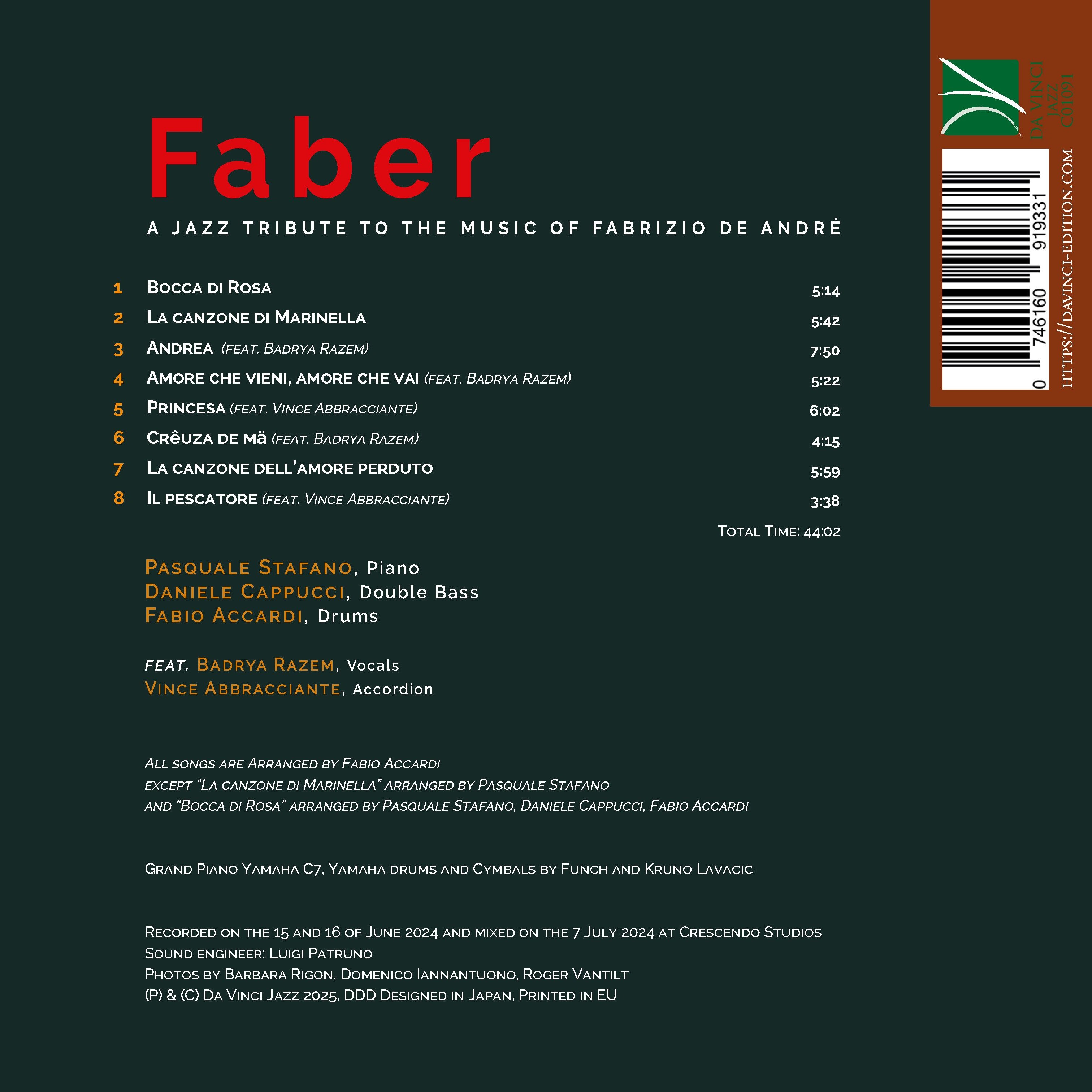 Fabrizio De André, detto affettuosamente Faber, fu poeta di compassione e ribellione, capace di intrecciare tenerezza, ironia e critica sociale. Questo omaggio rilegge le sue canzoni attraverso la lente del jazz. Pasquale Stafano al pianoforte, Daniele Cappucci al contrabbasso e Fabio Accardi alla batteria, con la voce intensa di Badrya Razem e la fisarmonica lirica di Vince Abbracciante, rivisitano brani iconici – Bocca di Rosa, La canzone di Marinella, Crêuza de mä, Il pescatore. Le melodie restano riconoscibili, ma armonie e ritmi respirano di nuovo. Gli arrangiamenti esplorano colori mediterranei, inflessioni modali, sottili echi di choro e tempi dispari, trasformando ogni pagina in dialogo più che in omaggio. Il trio privilegia la narrazione alla nostalgia: il pianoforte racconta, il contrabbasso custodisce memoria, la batteria lascia spazio. Abbracciante amplia le trame con fraseggio luminoso, Razem unisce fragilità e forza. Una reinvenzione sincera che mantiene viva l’etica dell’attenzione di De André.