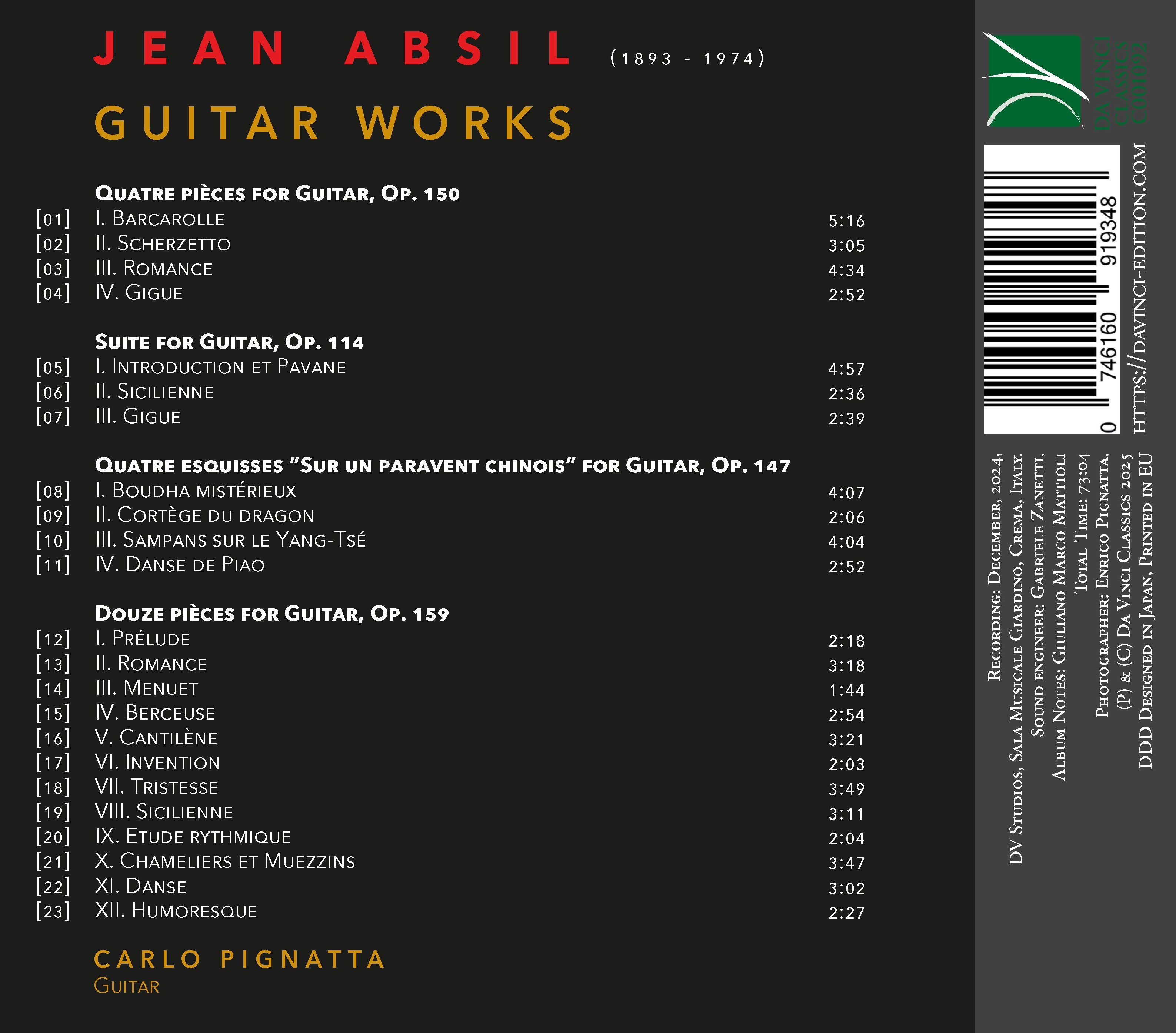 Jean Absil, modernista belga di fattura cristallina, si avvicinò tardi alla chitarra, ma con curiosità intatta. La sua scrittura, abituata a forze orchestrali e corali, trova nello strumento un luogo di intimità e chiarezza. Questa raccolta riunisce la neoclassica Suite op. 114, le pittoriche Quatre esquisses “Sur un paravent chinois”, le caratteriali Quatre pièces op. 150 e le concise Douze pièces op. 159. Barcarole, gighe, romanze e studi ritmici si snodano in trame trasparenti, inflessioni modali e contrappunto duttile: linguaggio progressivo eppure sempre cantabile. Gli schizzi cinesi brillano di suggestioni figurative, le pagine tarde condensano arguzia e canto in brevi miniature. Ne emerge non una curiosità, ma una voce distinta nella scrittura chitarristica moderna: Absil che mette alla prova forma e timbro come un pittore con i pennelli. L’esecuzione di Pignatta rende queste pagine suono rigoroso e intimo, riscoprendo un volto nascosto del modernismo novecentesco.