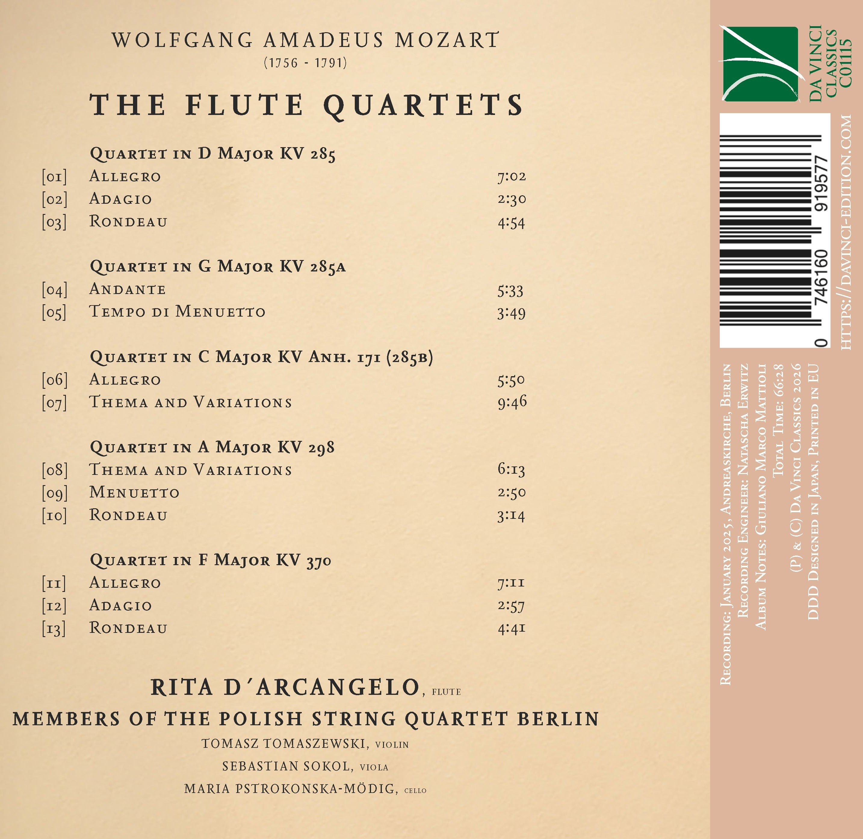 L’album The Flute Quartets di Wolfgang Amadeus Mozart, con il flauto di Rita D’Arcangelo e i componenti del Polish String Quartet Berlin, si colloca nel cuore della civiltà cameristica settecentesca, tra Mannheim, Parigi, Monaco e Vienna, lungo il viaggio del 1777-78 e negli anni immediatamente successivi. I cinque quartetti KV 285, KV 285a, KV Anh. 171, KV 298 e KV 370 mostrano un flauto non più relegato al virtuosismo ornamentale, ma voce pienamente integrata in una conversazione illuministica, in cui grazia di salon, teatralità in miniatura e sottile ricerca timbrica convivono. Dal notturno Adagio in Si minore del KV 285 al gioco di variazioni del KV 298, fino alla tensione quasi concertante del KV 370, il programma si configura come un piccolo romanzo sonoro sul tempo, sul canto strumentale e sulla sociabilità colta dell’età dei Lumi.
