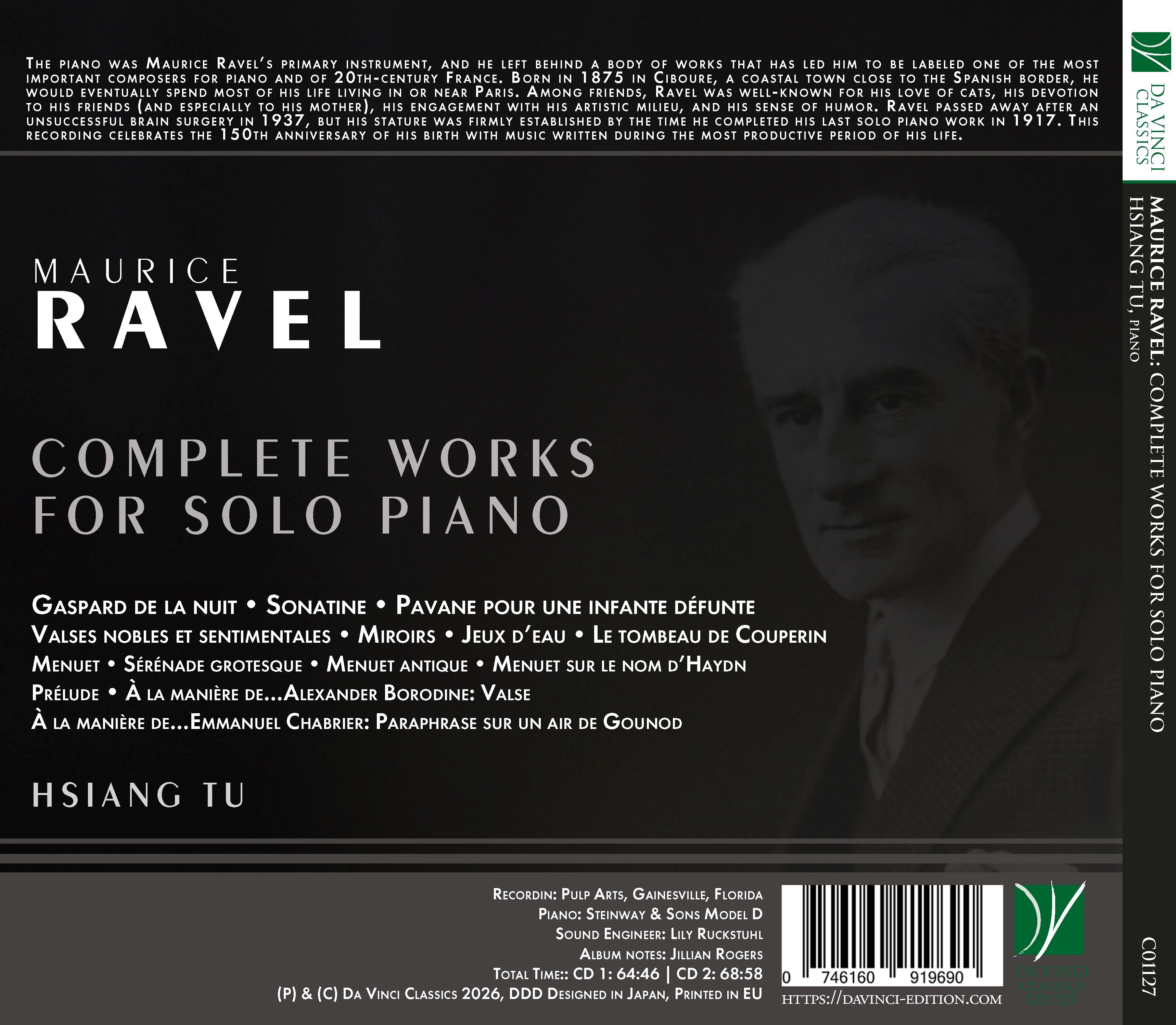 L’album Complete Works for Solo Piano offre un ritratto monografico e integrale dell’universo tastieristico di Maurice Ravel, concepito in occasione del centocinquantesimo anniversario della nascita. Dai saggi giovanili di Sérénade grotesque e Menuet antique alle architetture visionarie di Gaspard de la nuit e Miroirs, dalle pagine salottiere e sospese nel tempo di Pavane pour une infante défunte e Valses nobles et sentimentales fino al neoclassicismo elegiaco di Le tombeau de Couperin, il percorso segue quasi anno per anno il farsi di una poetica. Il pianoforte diventa laboratorio alchemico di timbri e, insieme, specchio interiore, in cui acqua, campane, maschere e danze arcaiche si condensano in emblemi sonori di una modernità tersa, cristallina, ma sottilmente perturbata.