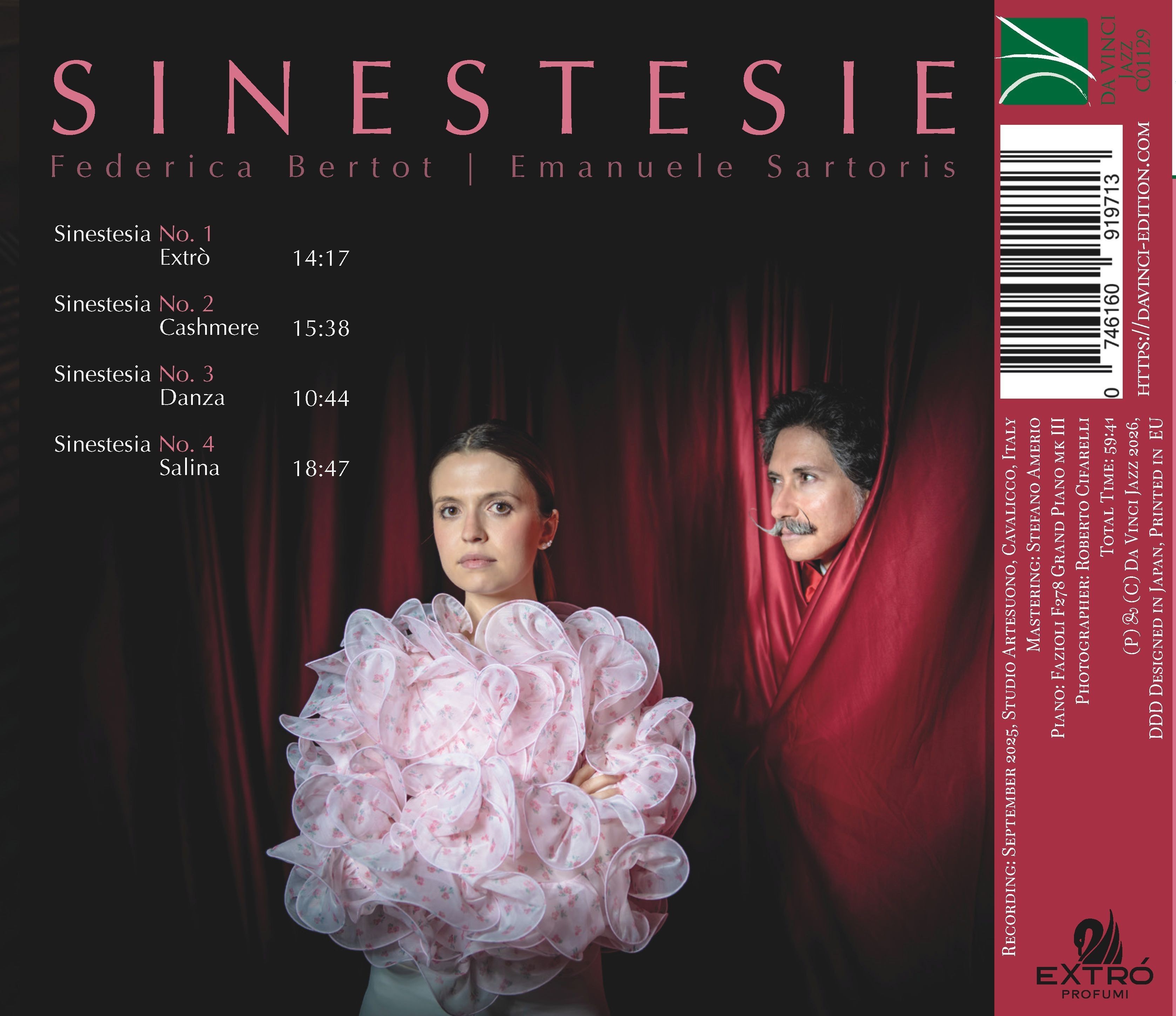 In Sinestesie la successione delle tracce assume la fisionomia di un ciclo in quattro quadri - Extra, Cashmere, Danza, Salina - e fa della sinestesia non un pretesto, bensì una legge di costruzione. Il suono vi è materia sensibile: tocca, illumina, profuma, deposita. La forma diviene gesto che mette in comunicazione sensazioni diverse, costruendo una drammaturgia delle qualità: eccesso e rarefazione, morbidezza tessile, impulso cinetico, trasparenza minerale. I titoli, lontani dalla didascalia, funzionano come indicazioni di densità, temperatura e grana, orientando l’ascolto verso un lessico di colori interiori. Ne nasce una suite di immagini, un itinerario unitario che interroga il confine fra percezione e memoria, e chiede all’orecchio di tradurre la luce in suono.