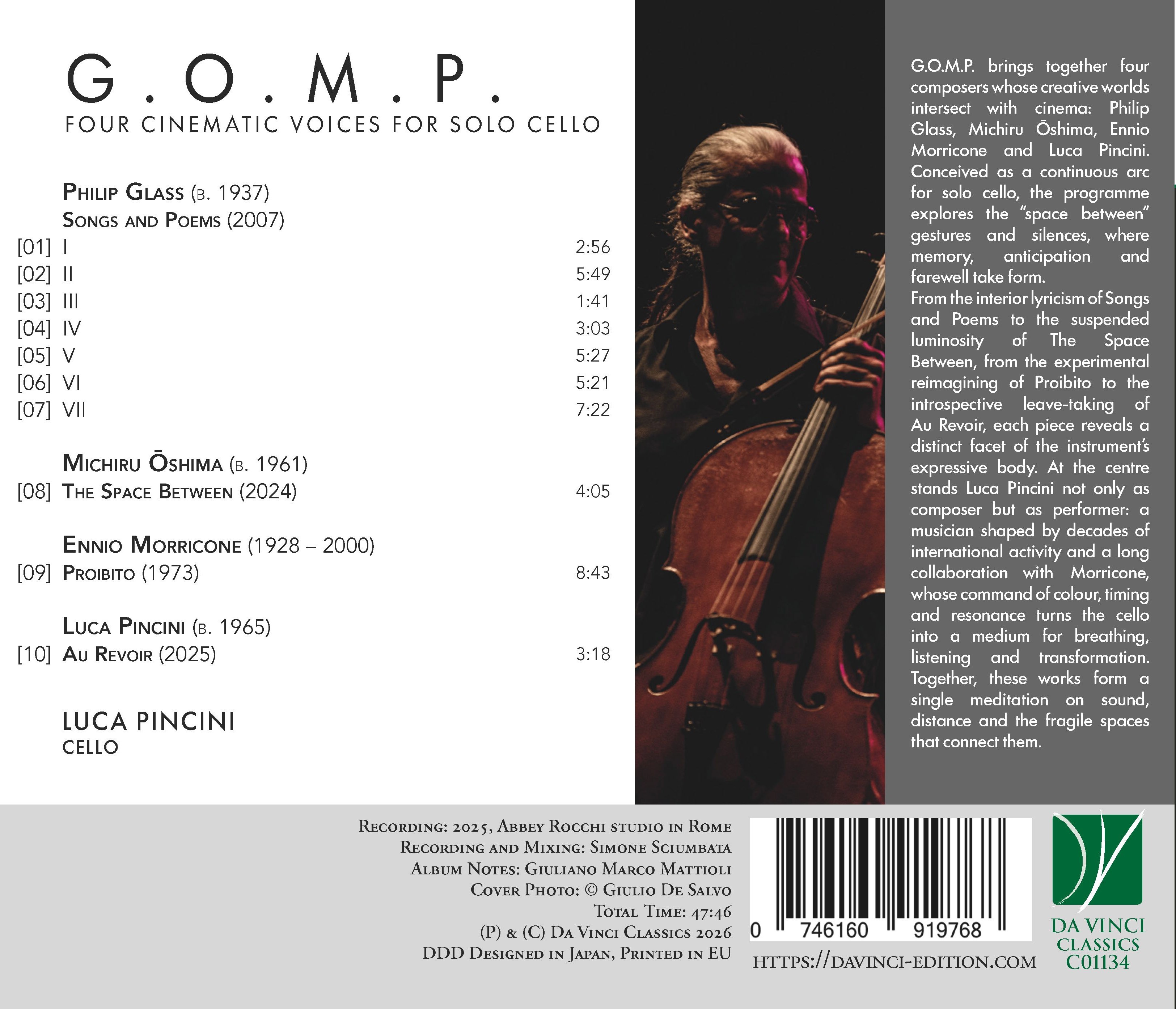 G.O.M.P.: Four Cinematic Voices for Solo Cello convoca quattro autori sotto un unico segno: lo spazio fra i suoni, quel margine di silenzio in cui la risonanza diventa pensiero e memoria. Dal rigore modulare di Philip Glass in Songs and Poems alla luminosità rarefatta di Michiru Ōshima in The Space Between, il percorso approda alla scrittura processuale di Ennio Morricone in Proibito, nata nell’orbita della Nuova Consonanza e qui trasposta in altra materia timbrica, per concludersi nel congedo raccolto di Au Revoir di Luca Pincini. Non un’antologia, ma un polittico coerente, che mette in dialogo cinema e concerto senza confonderne le grammatiche, e accoglie pagine di rara circolazione. In questo teatro delle distanze, la forma è una grammatica dell’attesa.