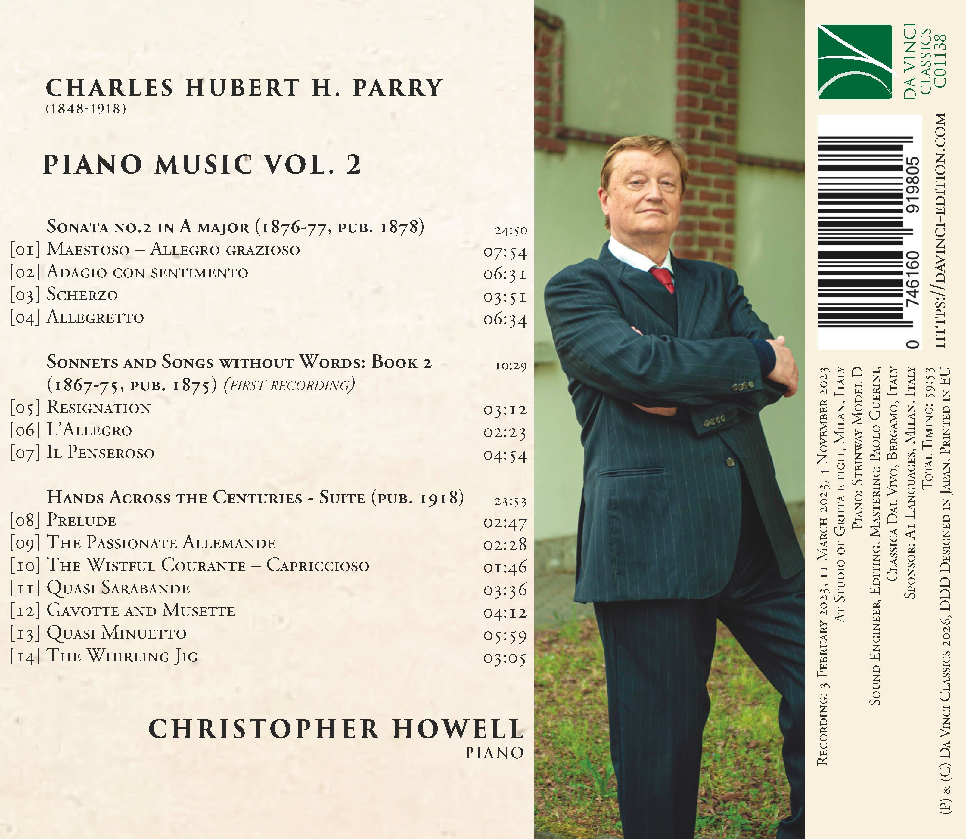 Piano Music Vol. 2 restituisce un volto poco frequentato di Charles H. H. Parry, collocando la sua scrittura fra tardo Ottocento e primo Novecento inglese. La Sonata n. 2 in La maggiore coniuga ambizione formale e sobria cantabilità, privilegiando chiarezza e governo dell’arco. I tre Sonnets and Songs without Words dal Libro 2 - Resignation, L’Allegro, Il Penseroso - traducono un immaginario letterario sospeso fra luce e meditazione. La suite Hands Across the Centuries (1918) ripensa le danze antiche come memoria stilizzata: Allemande, Courante, Sarabande e Jig diventano figure del tempo, non archeologia ma continuità del gesto. È un ponte fra secoli, dove l’antico si fa presente attraverso la disciplina della forma. Una retorica misurata, di pudore britannico, che dialoga con il continente senza perderne la propria fisionomia.