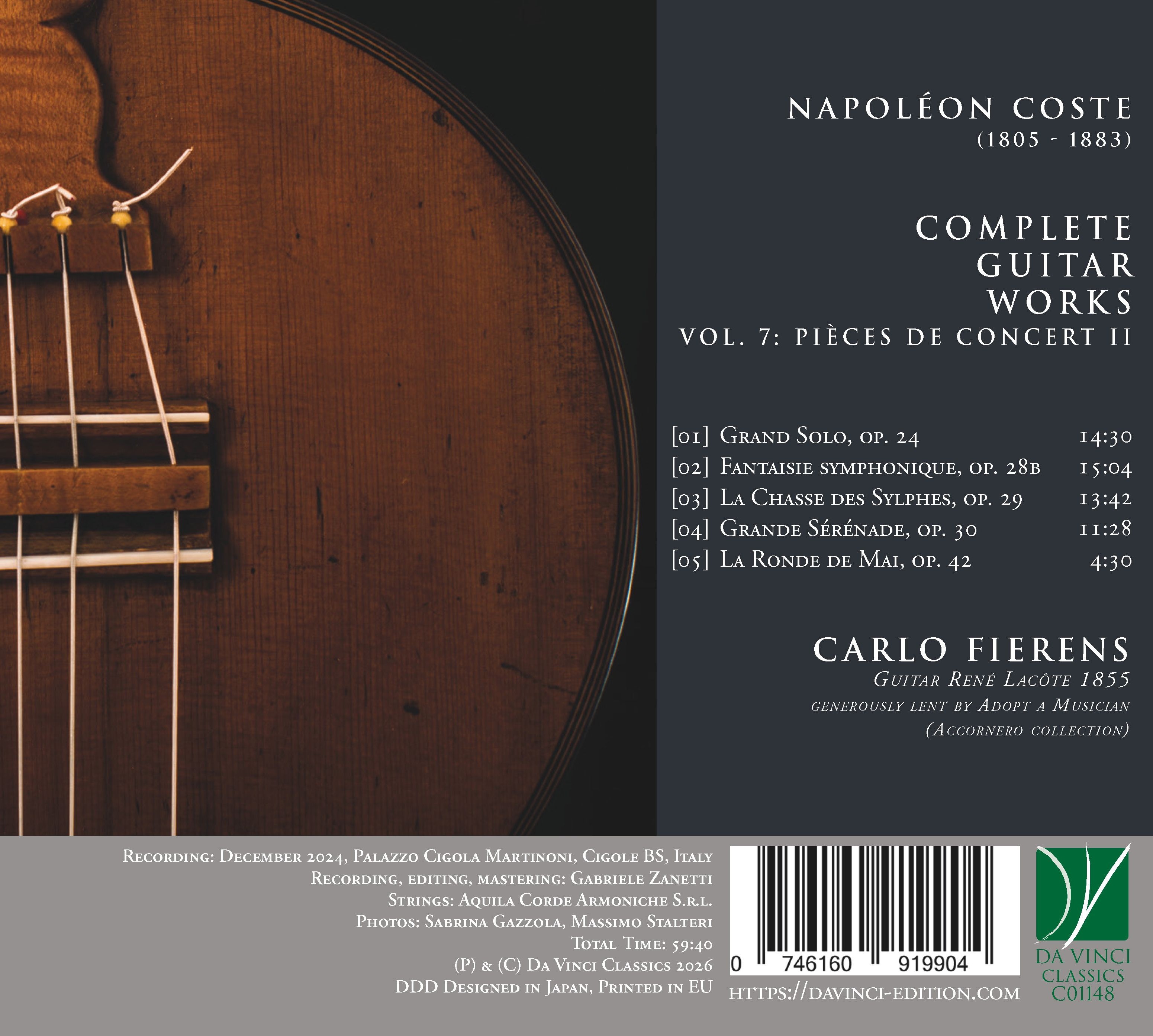 Il volume VII delle Complete Guitar Works di Napoléon Coste, Pièces de concert II, raduna alcune tra le sue pagine più ambiziose, nel clima parigino in cui la chitarra rivendica una dignità da grande forma. Al centro stanno le opere legate al concorso Makaroff del 1856: dalla Fantaisie Symphonique op. 28b, ampia e cangiante, alla Grande Sérénade op. 30, dove gesto teatrale e costruzione tematica si rincorrono. La Chasse des Sylphes op. 29 trasfigura l’immaginario romantico in narrazione strumentale; La Ronde de Mai op. 42 chiude con un divertissement che conserva l’eleganza del salotto senza perdere densità armonica. Ne emerge una poetica del virtuosismo come architettura, dove cantabilità e invenzione procedono insieme. Sullo sfondo, la heptacorde, orizzonte timbrico immaginato con Lacôte, amplia la tavolozza e la prospettiva.