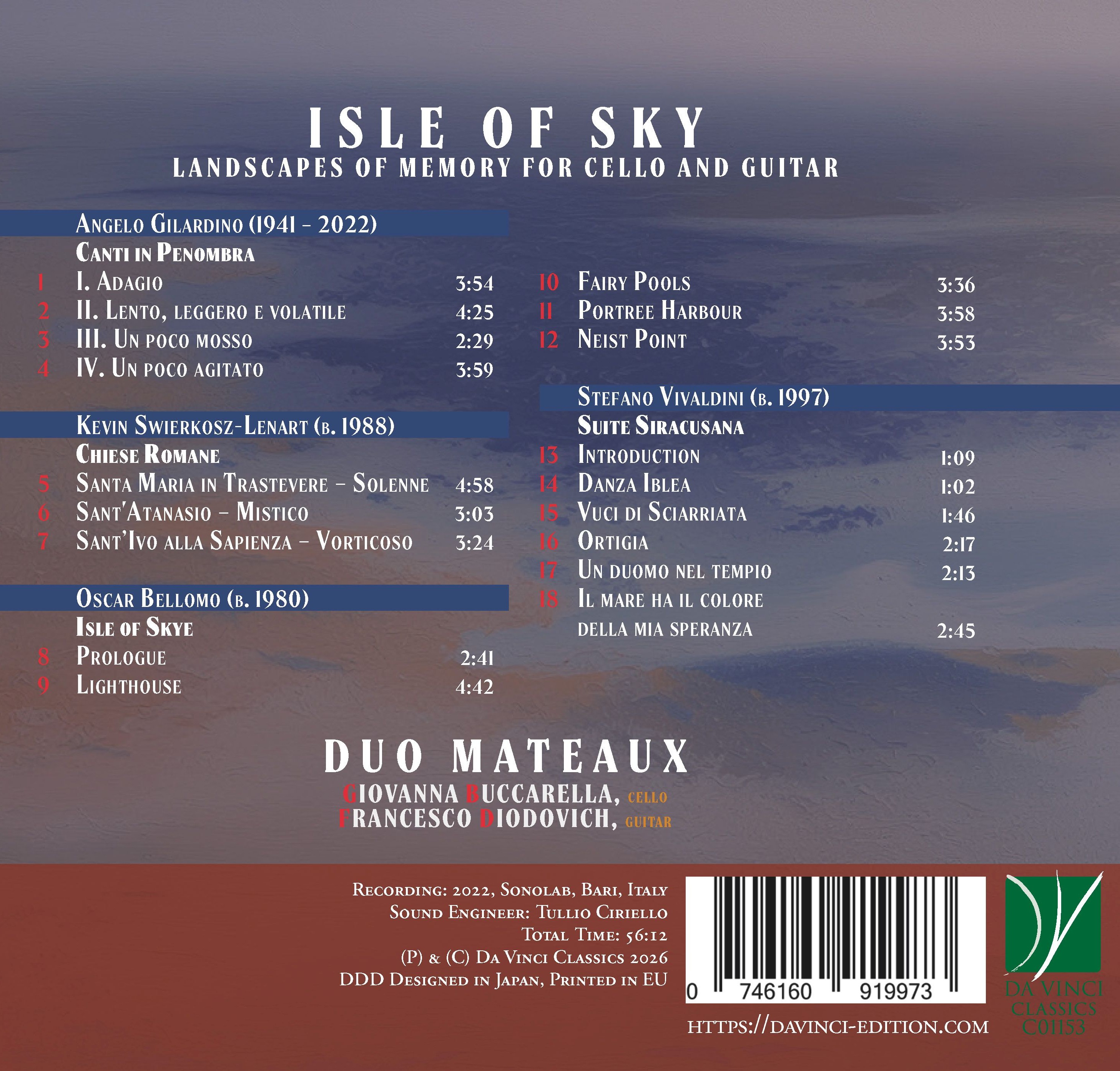 In Isle of Sky - Landscapes of Memory for Cello and Guitar la coppia violoncello-chitarra diviene dispositivo di racconto: trasforma luoghi in memoria e la memoria in paesaggio. Quattro sguardi contemporanei articolano una geografia interiore. In Canti in penombra di Gilardino la scrittura mette in scena una frattura, tra canto e allusione; Chiese Romane di Swierkosz-Lenart disegna tre momenti liturgici come topografia degli affetti; Bellomo, con Isle of Skye, cerca un’osservazione senza osservatore fra fari, cascate e orizzonti marini; Vivaldini, nella Suite Siracusana, compone cartoline sonore di Ortigia e del suo palinsesto antico, fino a un’invocazione finale al mare come colore della speranza. Pagine nate per il Duo Mateaux, nel segno di una memoria che cammina.