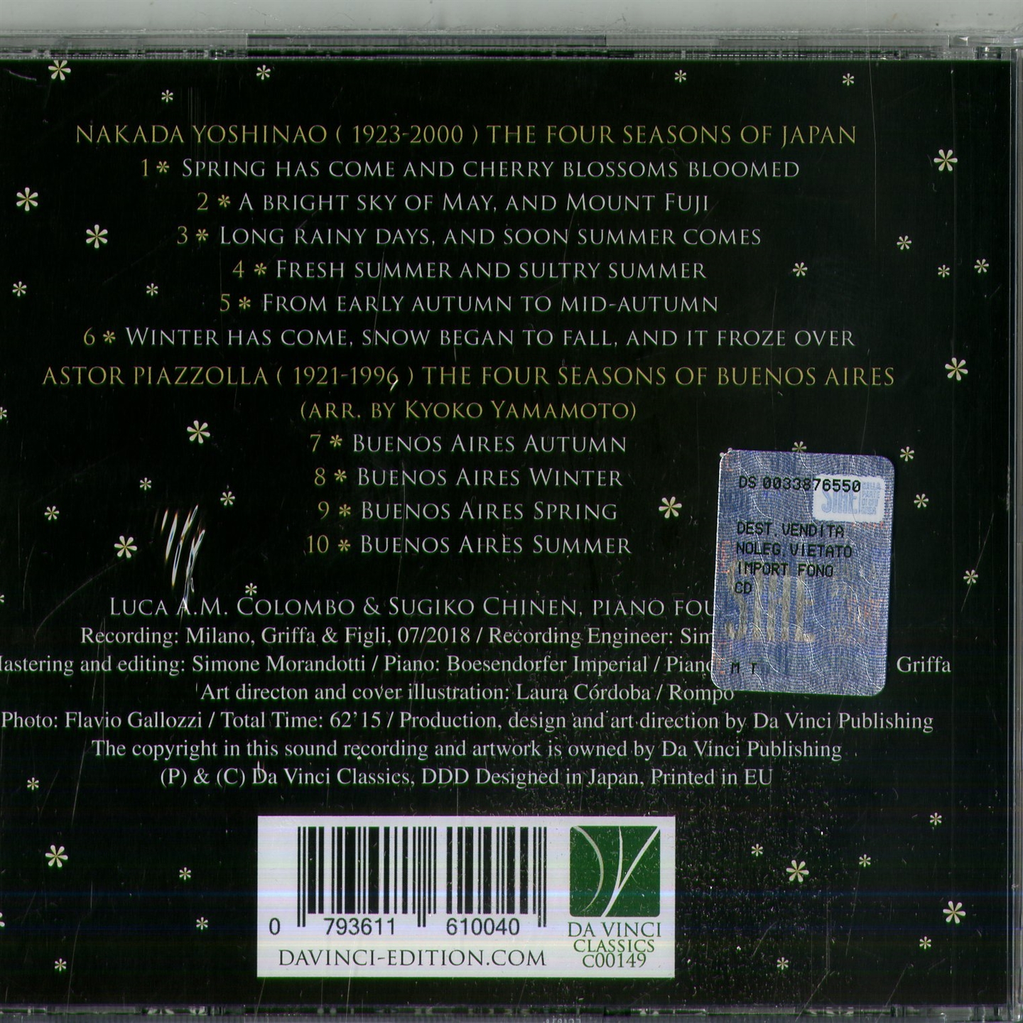 Le stagioni hanno accompagnato la storia del nostro mondo sin dagli inizi offrendo ispirazione artistica pressoché continua ed al pari del sentimento amoroso, vere protagoniste di una quantità innumerevole di opere dello spirito. Il duo pianistico composto da Luca Colombo e Sugiko Chinen prendono ad esame due composizioni di questa natura e le pongono a stretto confronto, da una parte le ormai note quattro stagioni di Buenos Aires di Astor Piazzolla (nella versione per pianoforte 4 mani di Kyoko Yamamoto), dall’altra le Four Seasons of Japan del compositore giapponese Yoshinao Nakada. Un confronto quanto mai affascinante, che mostra non solo due stili a confronto, ma anche come processi compositivi differenti possano portare ad uno stesso ed intenso risultato di insperata bellezza ed unità. Entrambi i compositori prendono infatti a piene mani dalla loro tradizione, Piazzolla dalla sua amata Argentina e usando il tango come mero pretesto per raccontare la sua visione delle stagioni e del mondo, Nakada invece si concentra maggiormente su temi popolari ricorrenti nella tradizione giapponese, vestendoli ed ampliandoli con armonie ora struggenti ora aspre che restituiscono a sua volta una descrizione viva e vibrante della propria terra che vanta alcuni dei paesaggi più poetici del mondo. Entrambi quindi offrono una visione del loro personale mondo sonoro filtrato dai quattro periodi dell’anno in un susseguirsi continuo di colori, suggeriti magistralmente dal duo pianistico che rimane attentissimo a sottolineare ogni aspetto di queste due magnifiche opere e che fanno idealmente incontrare due mondi distanti solo geograficamente.