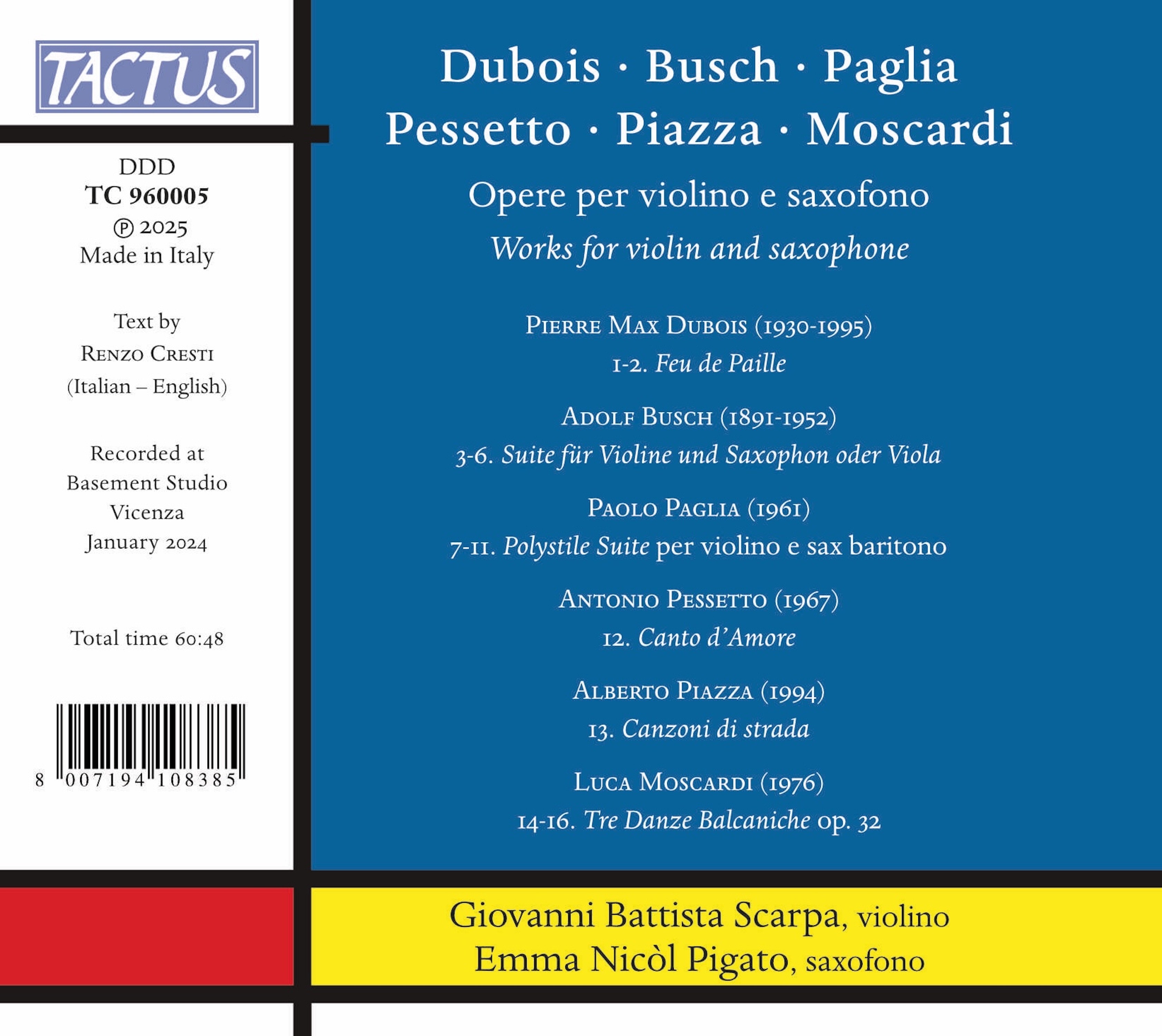 Se l’omologazione è uno dei problemi principali della nostra società, la pubblicazione di un compact-disc che esce dalla solita musica, quella che gira attorno al repertorio consolidato, per presentare un programma originale va salutata con entusiasmo, lo stesso che ci hanno messo i due interpreti nella ricerca di un repertorio nuovo e nell’esecuzione appassionata e accurata. È un progetto discografico che ha come finalità l’interpretazione e la diffusione delle musiche originali scritte per violino e sax di autori diventi e del passato. Al repertorio del ‘900 (i brani di Adolf Busch e Pierre Max Dubois, qui presenti come doverosi omaggi a chi aveva intuito le capacità dello strano duo violino e sax) vengono accostate opere di autori contemporanei appositamente scritte per Scarpa-Pigato. La varietà di linguaggi si dipana attraverso composizioni post-tonali (Paolo Paglia e Luca Moscardi), seriali (Antonio Pessetto) ed evocative (Alberto Piazza). L’accostamento timbrico inusuale fra il violino e i differenti colori della famiglia del sax, realizza un impatto sonoro innovativo e sorprendente. Il trasporto che gli interpreti mettono nelle esecuzioni è quel quid che la musica contemporanea va cercando da tempo. Dedizione al lavoro fin nei particolari ed eccitazione interpretativa è uno sposalizio vincente.