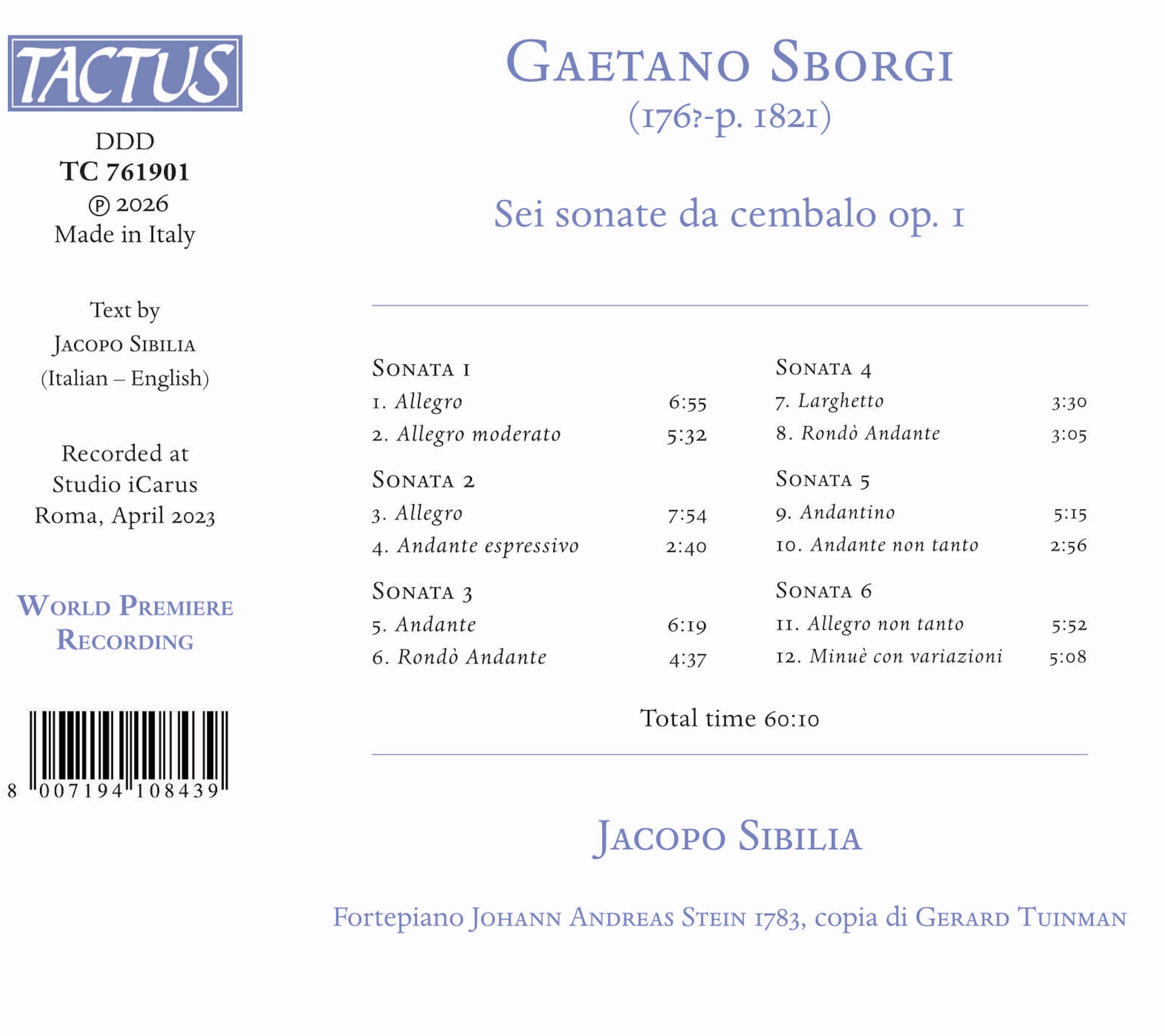 non conosciamo con precisione la data di nascita e di morte di Gaetano Sborgi, compositore vissuto a cavallo tra la seconda metà del xviii sec. e gli inizi del xix. Possiamo affermare con ragionevole sicurezza che lo Sborgi sia nato a Firenze, in quanto nel frontespizio delle sue sonate afferma di essere fiorentino. Sborgi fu maestro di cappella e piano-forte nell’Imperial Accademia delle Belle Arti di Firenze. Studiò con il fratello (o padre secondo il Picchianti) Gasparo e poi si trasferì a Napoli nel Conservatorio di S. Onofrio, dove ebbe come compagno Marco Santucci ed in cui si trattenne per diciassette anni. Tornato a Firenze «si fece conoscere... con diversi suoi pezzi teatrali di vero buon gusto, ed in altri di diverso genere. Fece stampare tre opere di sonate pel pianoforte, le quali danno a divedere il suo genio ed il suo talento». Le Sei sonate da cembalo dedicate a Lorenzo Niccolini, ciamberlano di Pietro Leopoldo i e di Ferdinando iii, possono essere inserite nell’alveo di quelle composizioni che mostrano il graduale passaggio dal tradizionale cembalo a corde pizzicate a quello di nuova concezione, a piano et forte, a corde percosse. Jacopo Sibilia si avvale per l'esecuzione di una copia di un fortepiano Stein del 1783, che può essere utilizzato con due diversi tipi di meccanica, al fine di rendere l'esecuzione più espressiva ed armonica.