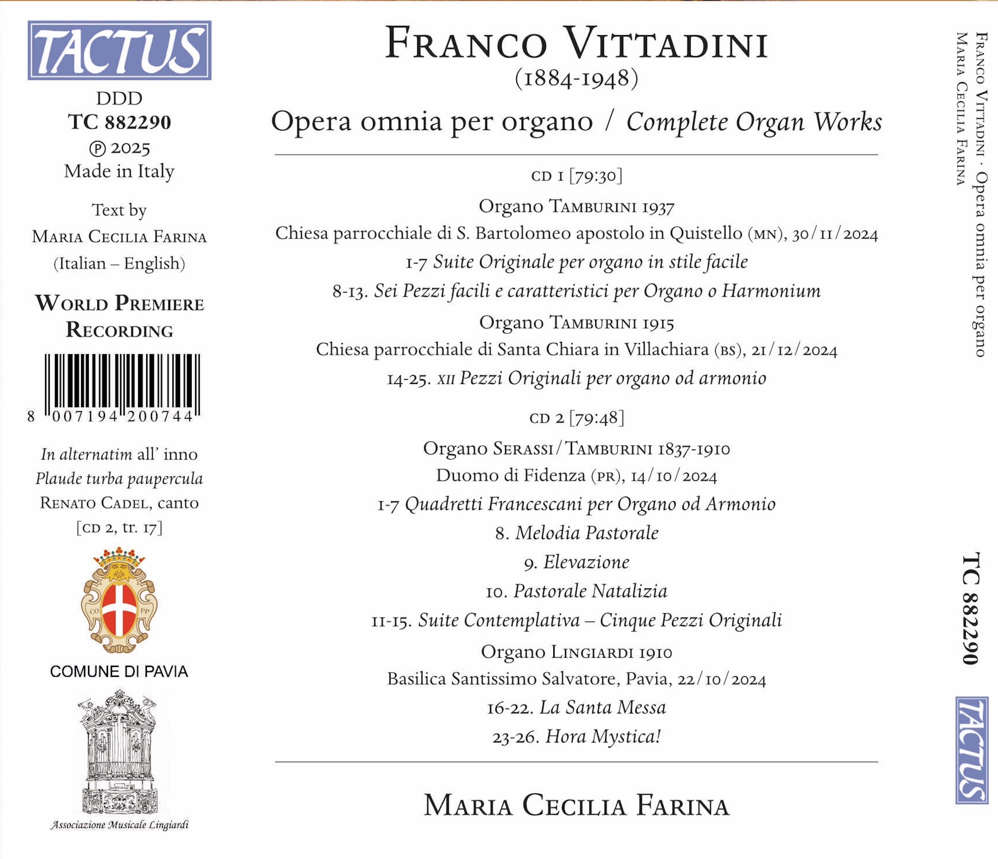 Tra i musicisti di rilievo nati nella città di Pavia, Franco Vittadini è senza dubbio uno dei più significativi. In suo onore è intitolato l'Istituto Superiore di Studi Musicali della città, di cui fu direttore dal 1924 fino alla morte. Maria Cecilia Farina utilizza organi storici sui quali esegue in modo preciso e filologico la musica organistica dell'autore. Raramente - e sempre in ossequio al contesto liturgico - Vittadini impiega un linguaggio grandioso e solenne, utilizzando sonorità da organo pleno o abbandonandosi a esibizioni virtuosistiche. La sua cifra stilistica è invece una dolce malinconia: un'atmosfera crepuscolare - paragonabile alla poesia di Guido Gozzano o di Sergio Corazzini - e un atteggiamento contemplativo, idilliaco/nostalgico pervadono le sue pagine, esprimendo il suo senso della fede.