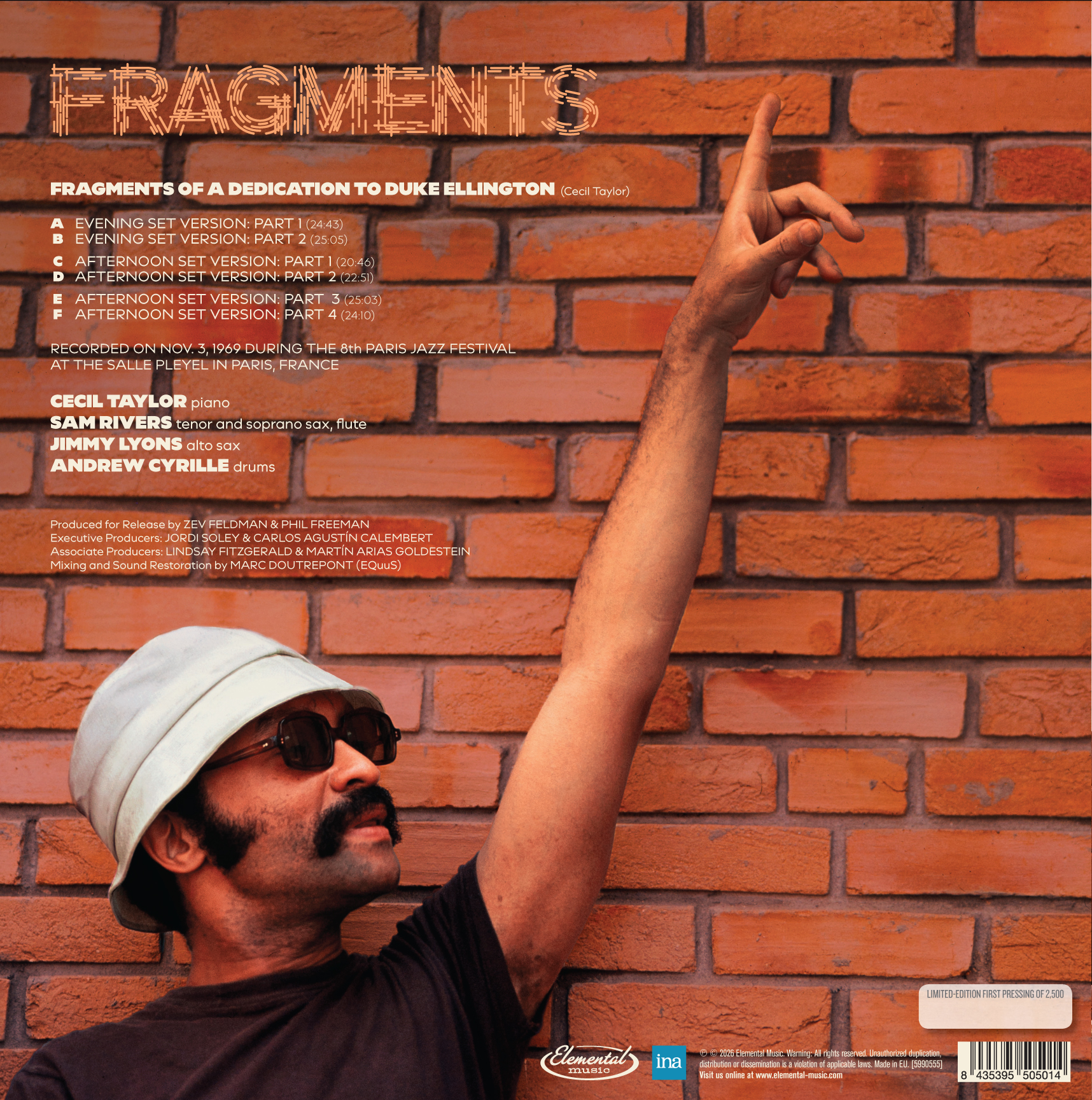 "Cecil Taylor - Fragments: The Complete 1969 Salle Pleyel Concerts" è una monumentale registrazione dal vivo mai pubblicata prima che cattura la Cecil Taylor Unit all'8° Festival Jazz di Parigi il 3 novembre 1969, nell'esecuzione di due set completi alla leggendaria Salle Pleyel. Questo storico concerto presenta una formazione di prim'ordine con Cecil Taylor (pianoforte), Sam Rivers (sax tenore e soprano, flauto), Jimmy Lyons (sax alto) e Andrew Cyrille (batteria).
