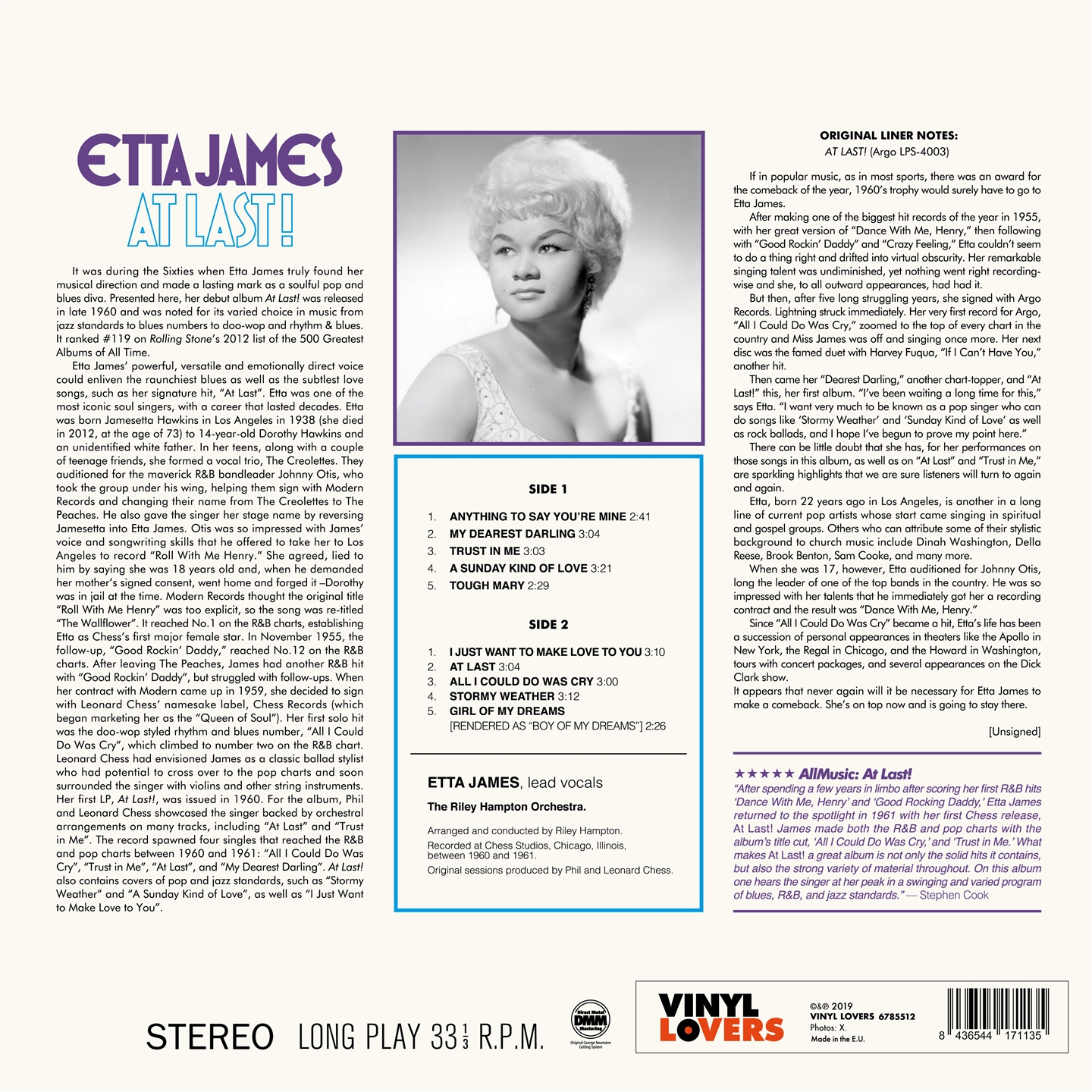 Etta James è stata una delle più grandi cantanti R&B di tutti i tempi, con una voce che ancora oggi incanta chi l’ascolta. Questa pubblicazione ripropone il suo sensazionale album di debutto, “At Last!”, pubblicato originariamente dalla Chess Records nel 1960. Questo album è considerato non solo l’album più rappresentativo di Etta James, ma anche uno dei migliori album Soul e R&B di tutti i tempi. Dal disco sono stati tratti quattro singoli che hanno scalato le classifiche R&B e pop tra il 1960 e il 1961: “All I Could Do Was Cry”, “Trust in Me”, “At Last” e “My Dearest Darling”.