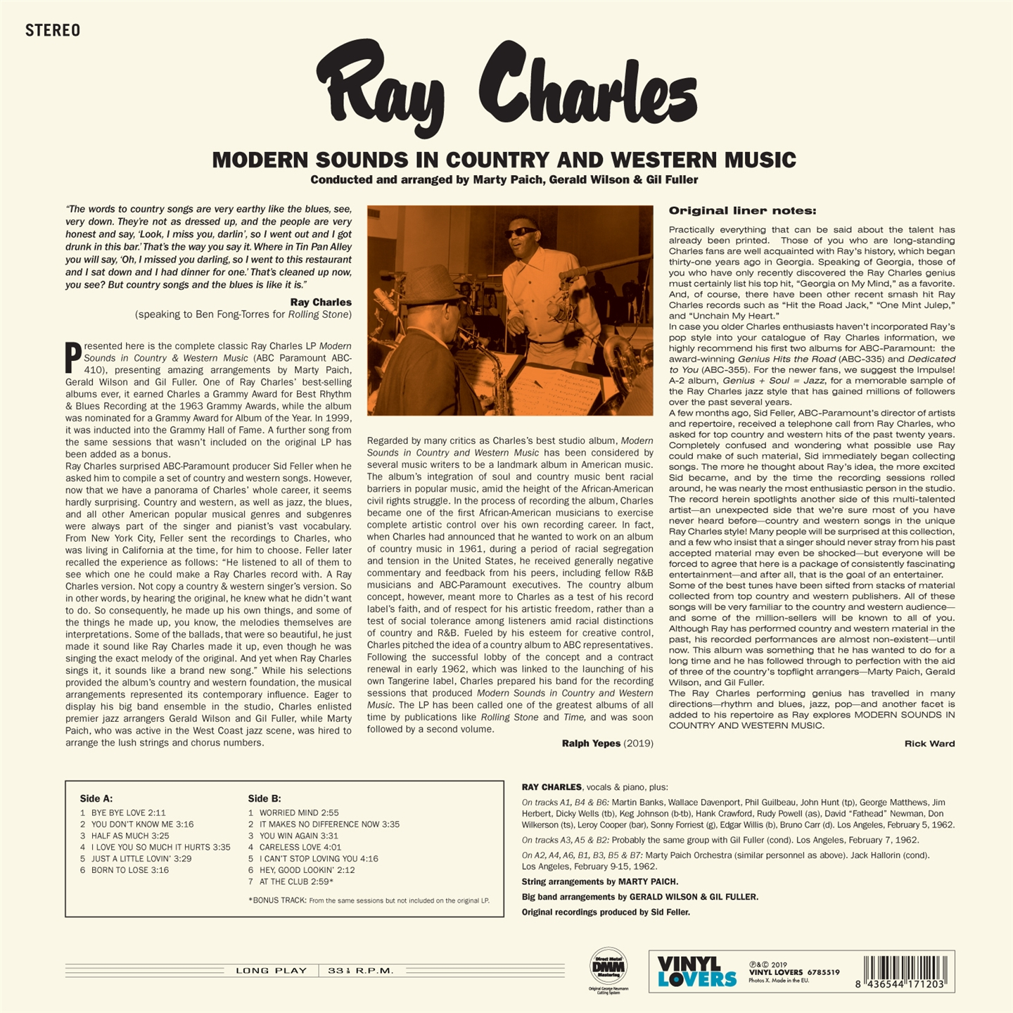 Il produttore Sid Feller fu sorpreso quando Ray Charles gli chiese di realizzare una raccolta di brani country e western. Tuttavia, ora che abbiamo un panorama di tutta la carriera di Charles, risulta chiaro che country e western, così come il jazz, il blues, e tutti gli altri generi musicali popolari americani, sono sempre stati parte integrante del linguaggio del grande cantante e pianista. “Modern Sounds in Country & Western Music” (ABC Paramount ABC-410) è stato uno degli albumi più venduti da Ray Charles nel corso della sua carriera e gli è valso un Grammy Awards nel 1963 come Best Rhythm & Blues Recording, oltre ad essere incluso nella Grammy Hall of Fame nel 1999. Come bonus di questa nuova edizione è stato aggiunto un brano, “At The Club”, registrato nel corso della stessa sessione, ma non apparso sull’LP originale.