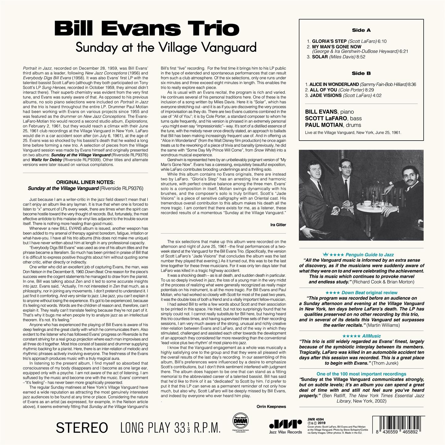 Sunday at the Village Vanguard (Riverside RLP9376) è stato il primo dei due LP tratti dalle registrazioni del 1961 al Village Vanguard, del trio di Bill Evans. Questa registrazione rappresenta anche l’ultima esibizione del gruppo formato da Bill Evans al piano, Paul Motian alla batteria e Scott LaFaro al basso. Quest’ultimo sarebbe infatti scomparso poco dopo in un incidente stradale, il 6 luglio 1961 all''età di soli 25 anni. La sinergia che univa il trio Evans-LaFaro-Motian si era già evidenziata in altri precedenti lavori (“Portrait in Jazz” e “Explorations”), ma si rafforza nell’esibizione al Village Vanguard. Un connubio speciale rotto dopo la scomparsa di LaFaro, che indusse Evans ad una lunga pausa prima di formare un nuovo trio.