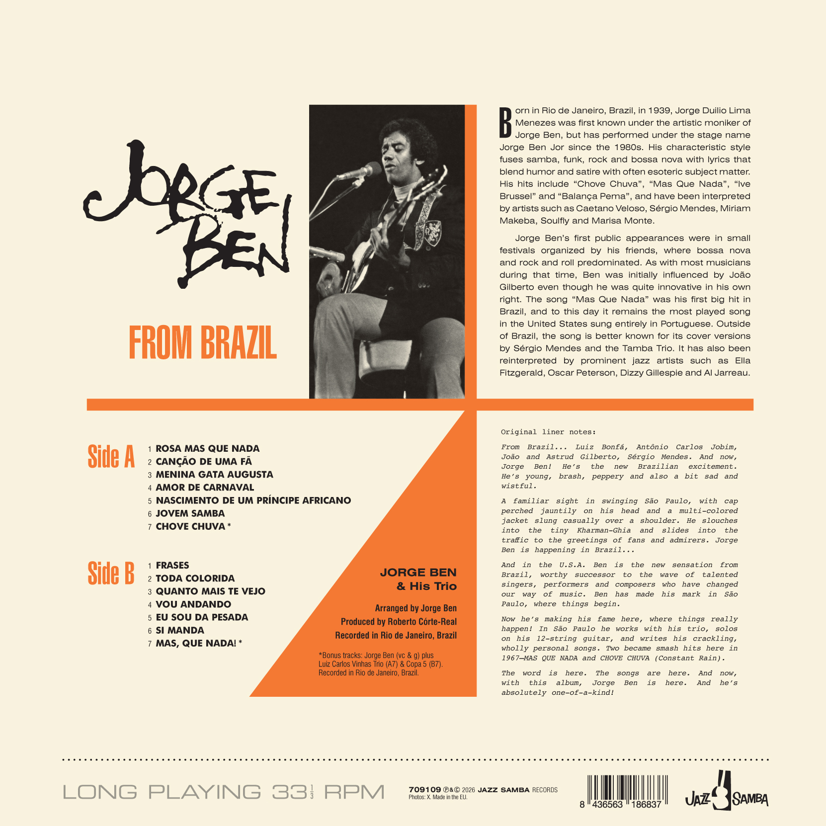 Nato a Rio de Janeiro, in Brasile, nel 1939, lo stile caratteristico di Jorge Ben fonde samba, funk, rock e bossa nova con testi che mescolano umorismo e satira con argomenti spesso esoterici. I suoi successi includono "Chove Chuva", "Mas Que Nada", "Ive Brussel" e "Balança Pema", e sono stati interpretati da artisti come Caetano Veloso, Sérgio Mendes, Miriam Makeba, Soulfly e Marisa Monte. Il brano "Mas Que Nada", qui incluso come bonus, è stato il suo primo grande successo in Brasile, e a tutt'oggi rimane la canzone più suonata negli Stati Uniti cantata interamente in portoghese.
