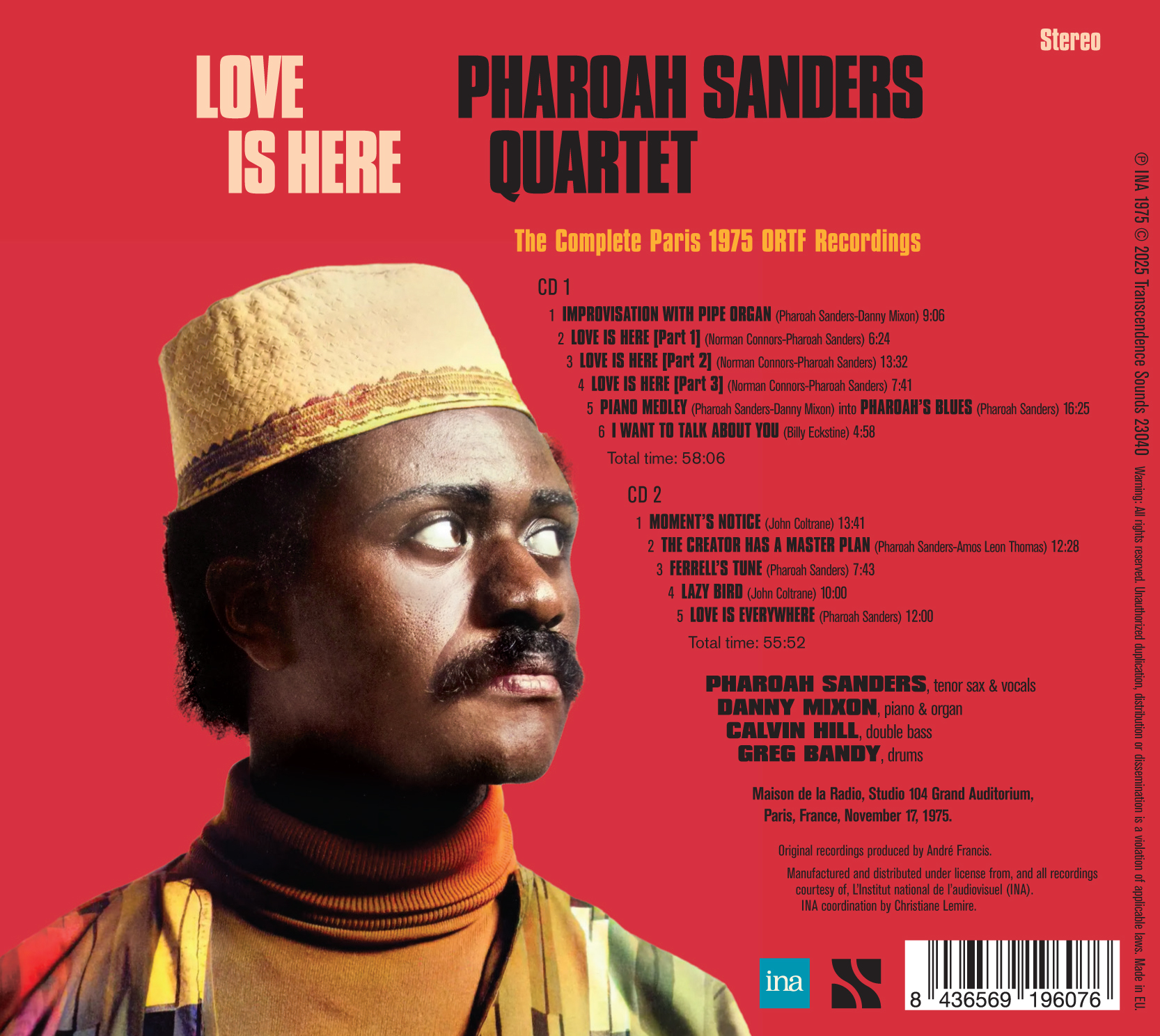 LE REGISTRAZIONI COMPLETE DEL 1975 DI PHAROAH SANDERS ALLA MAISON DE LA RADIO DI PARIGI. Trasferite dalle bobine originali di nastro STEREO dell'INA (Institut national de l'audiovisuel) francese. Include un libretto di 12 pagine con rare foto di Christian Rose e un saggio esclusivo di Kevin Whitehead, storico collaboratore di Down Beat.